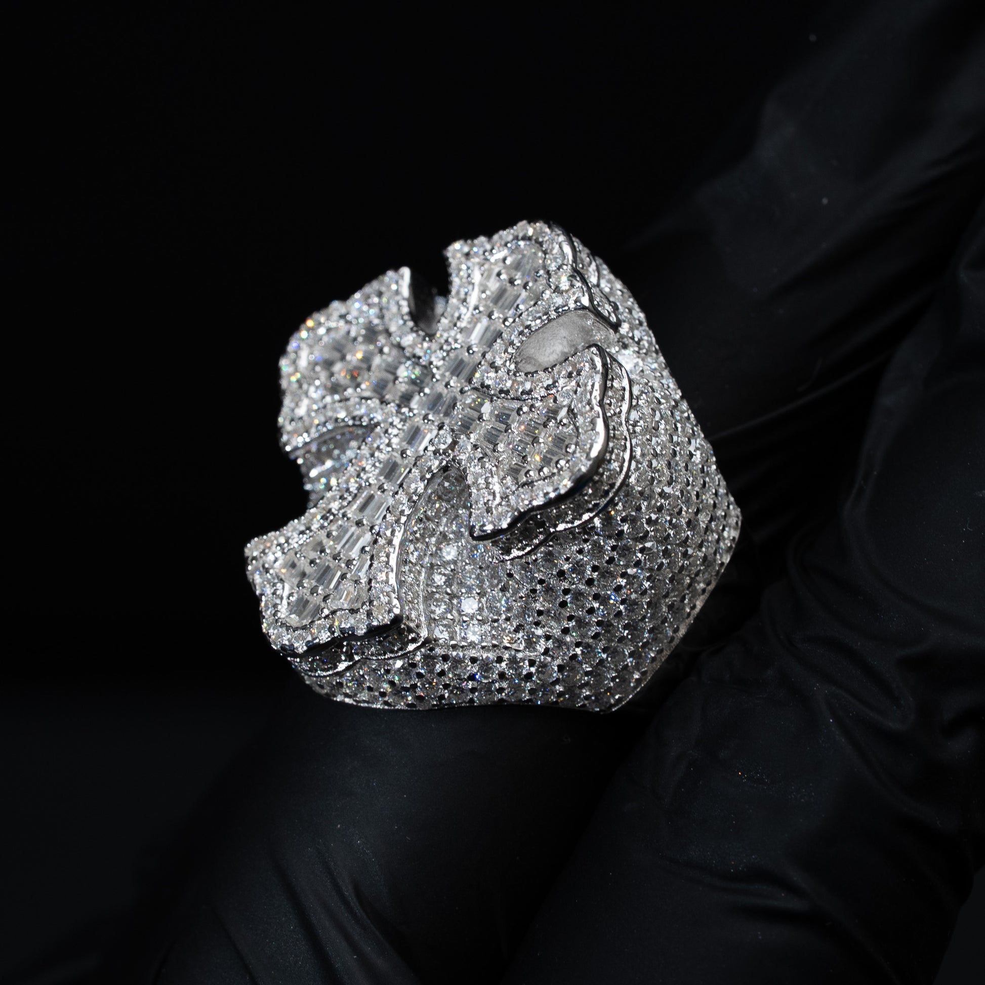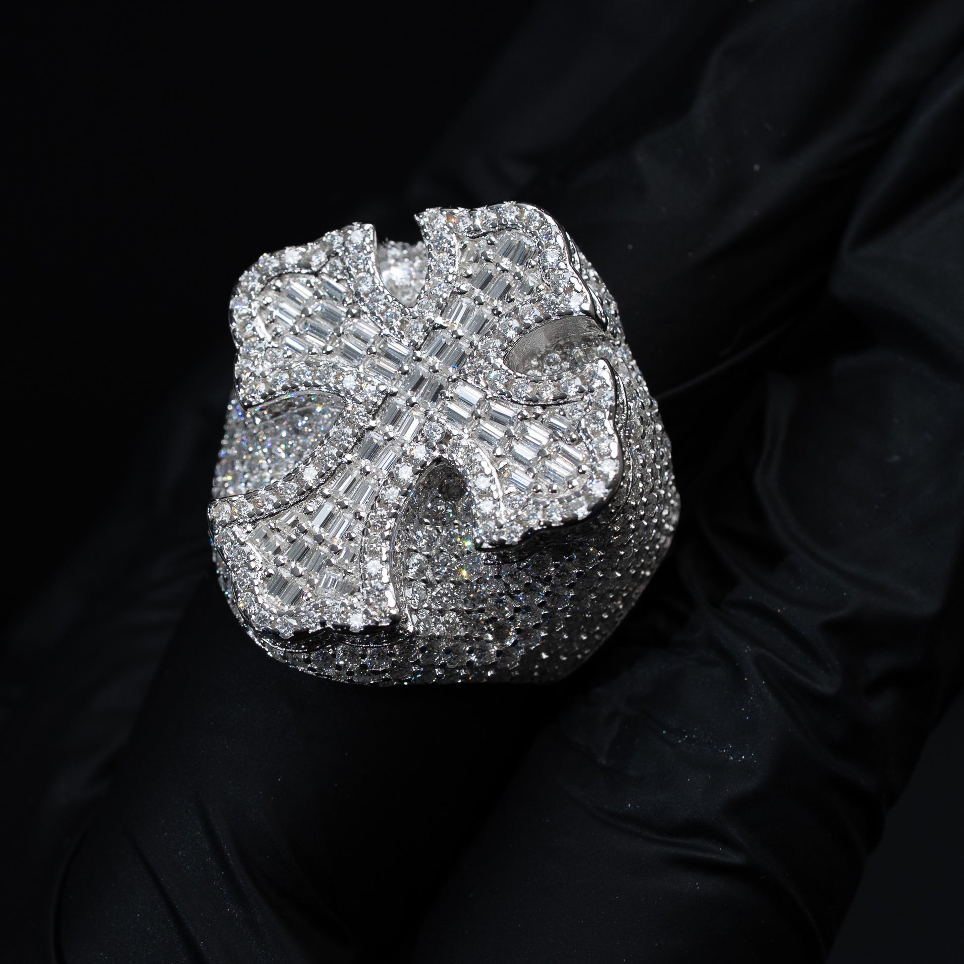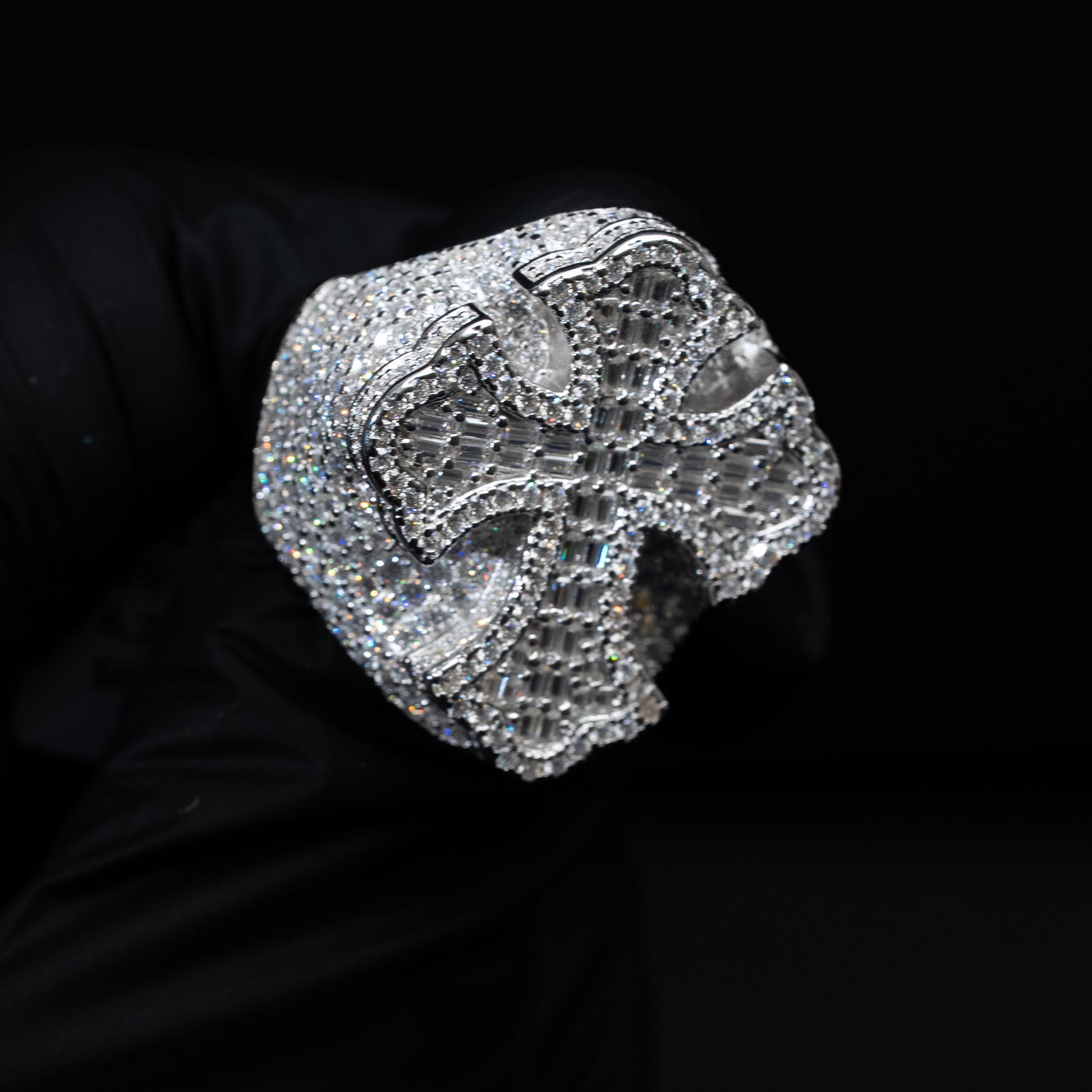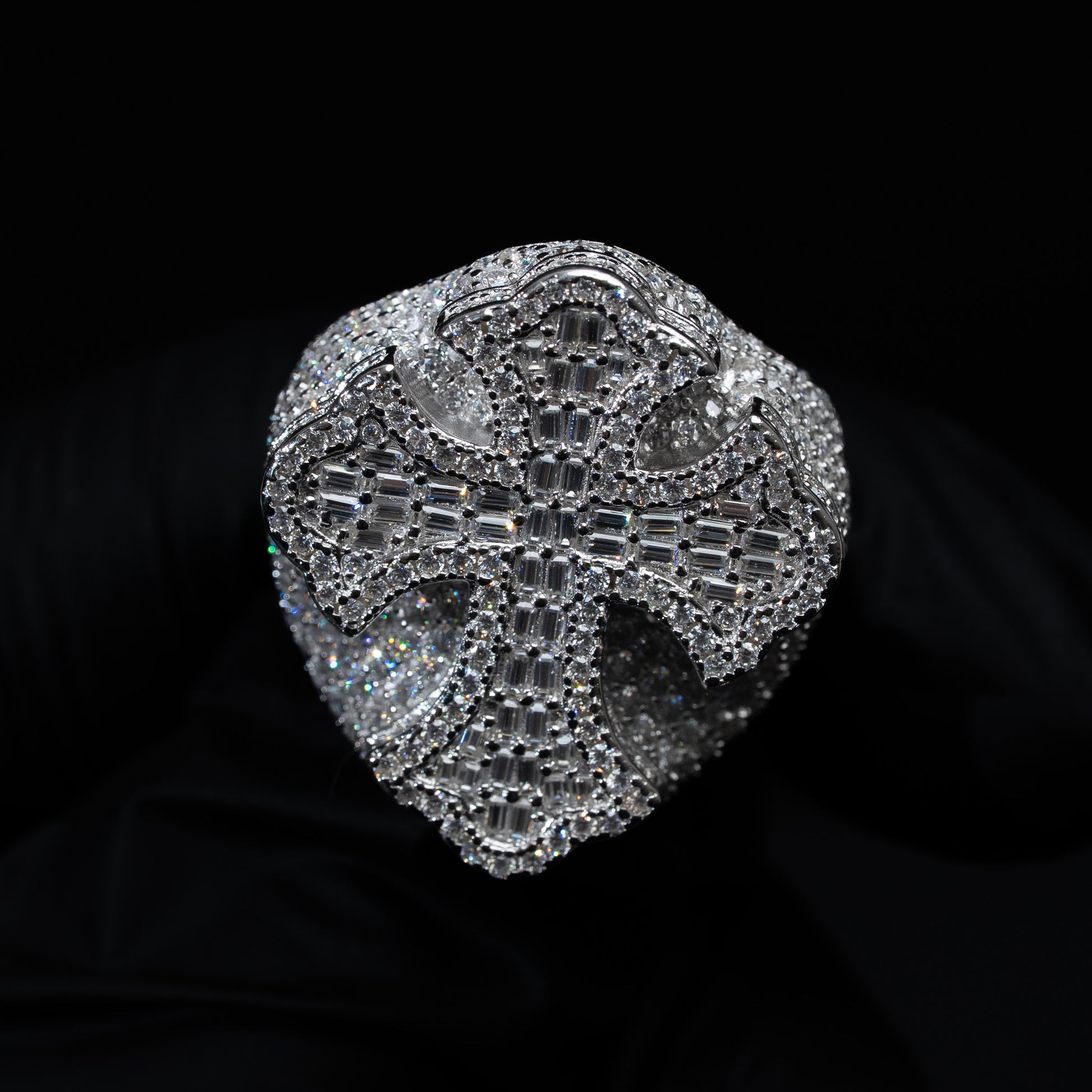 This cross ring is a powerful blend of faith and luxury. Crafted from solid 925 sterling silver, it features a fully iced cross design with appx. 6.26 carats of sparkling VVS1 D color moissanite, combining baguette and round cuts for maximum brilliance.