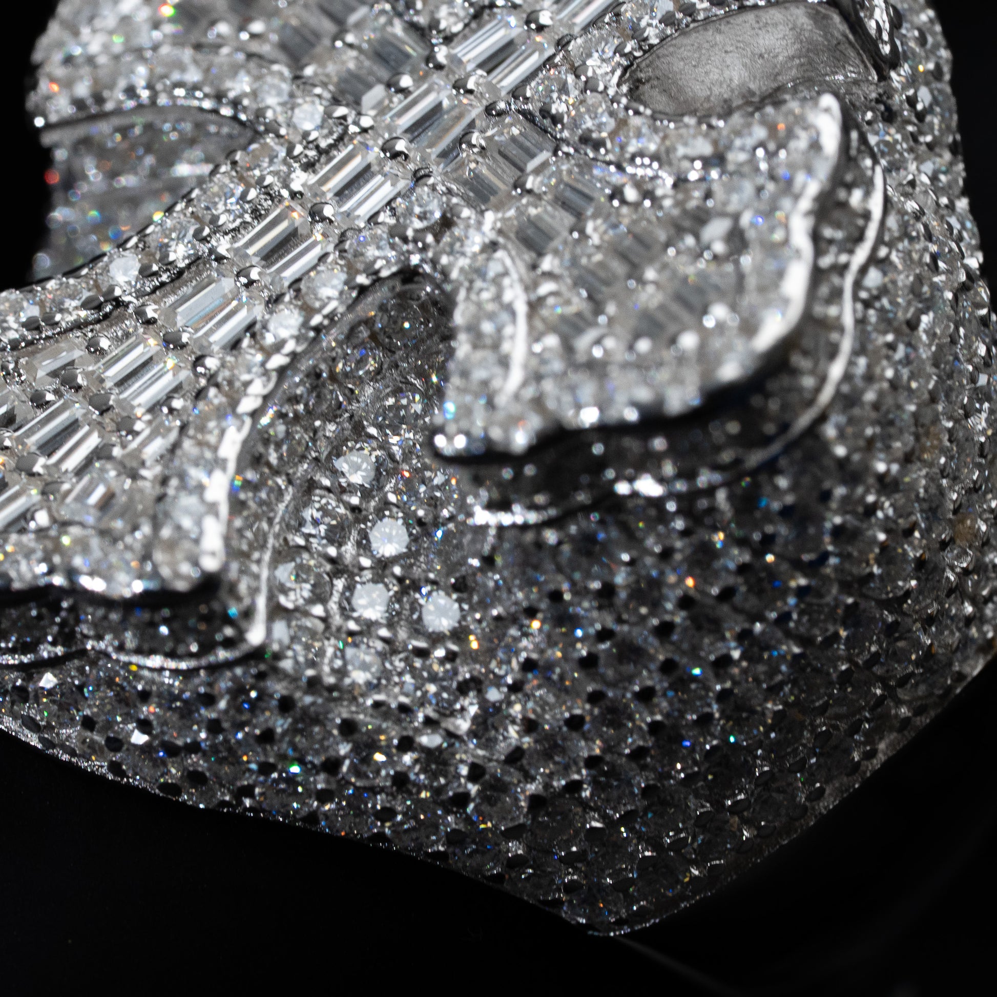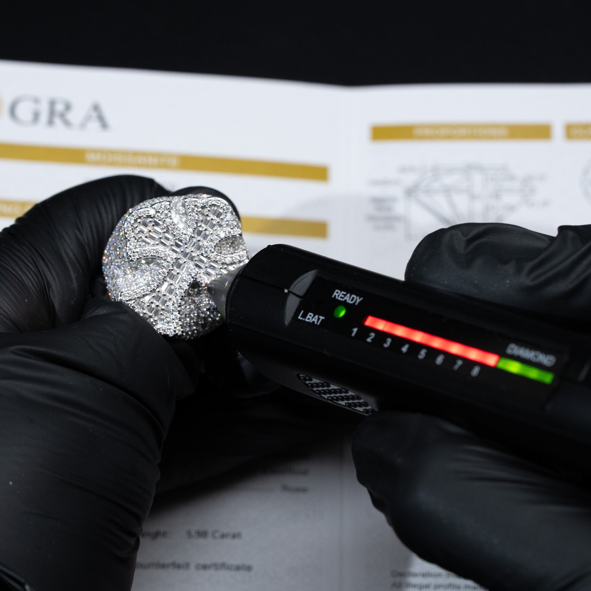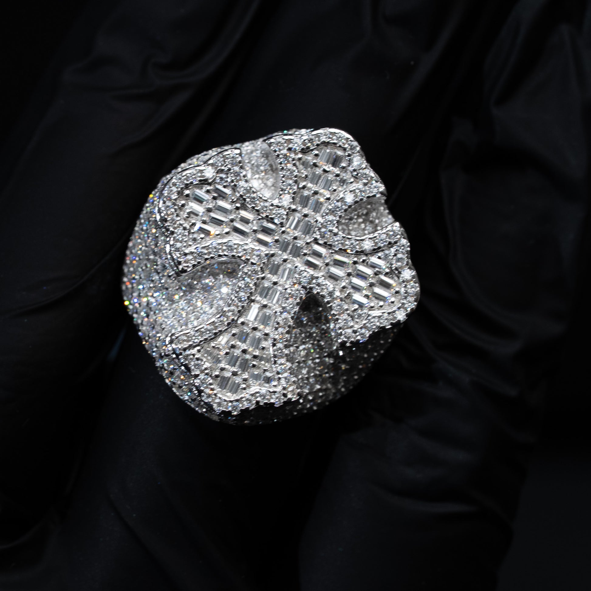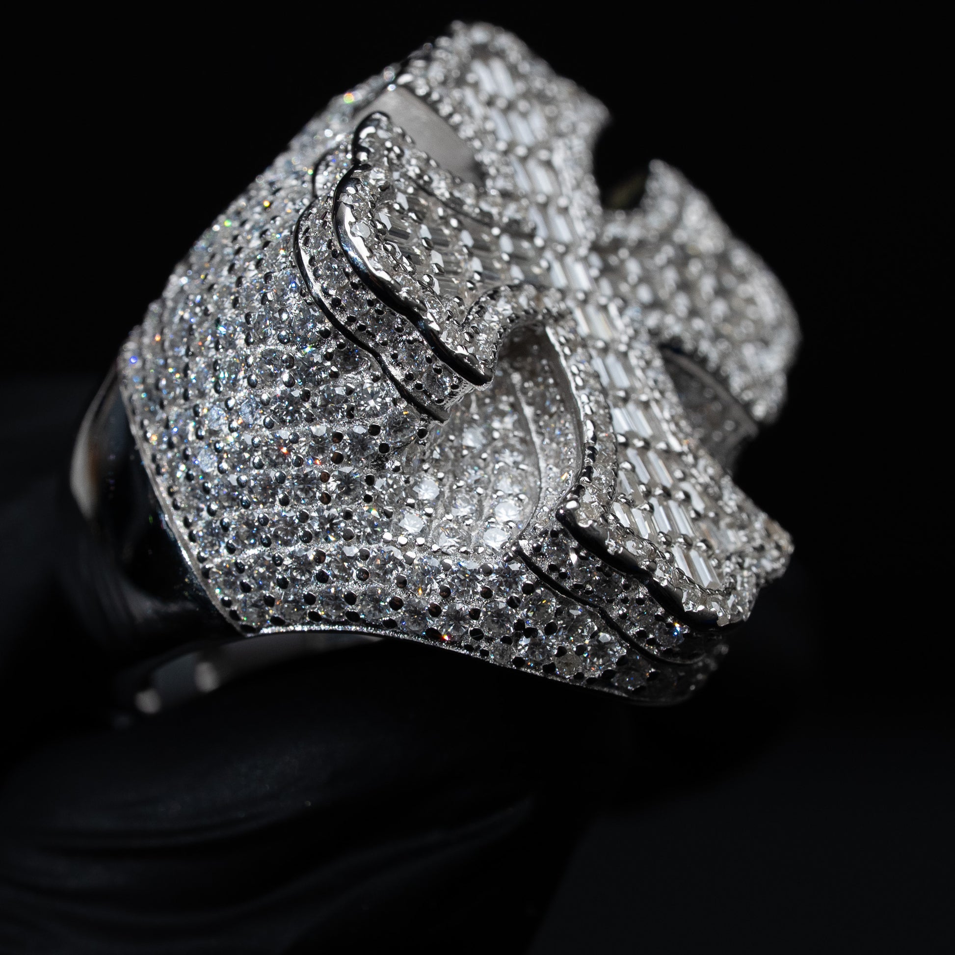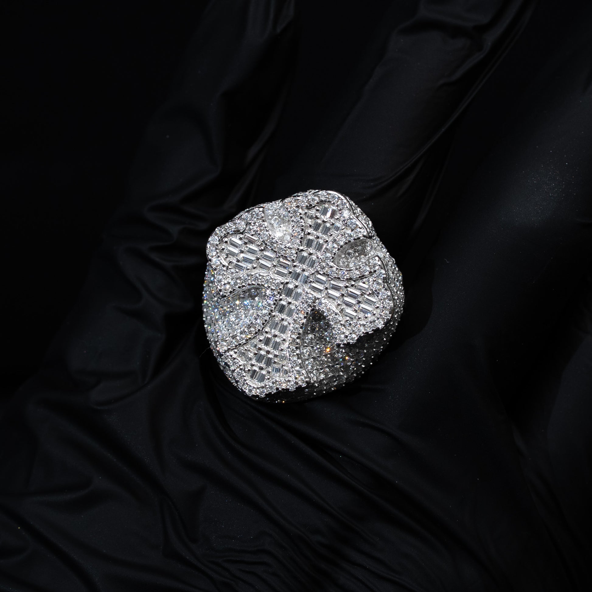 This cross ring is a powerful blend of faith and luxury. Crafted from solid 925 sterling silver, it features a fully iced cross design with appx. 6.26 carats of sparkling VVS1 D color moissanite, combining baguette and round cuts for maximum brilliance.