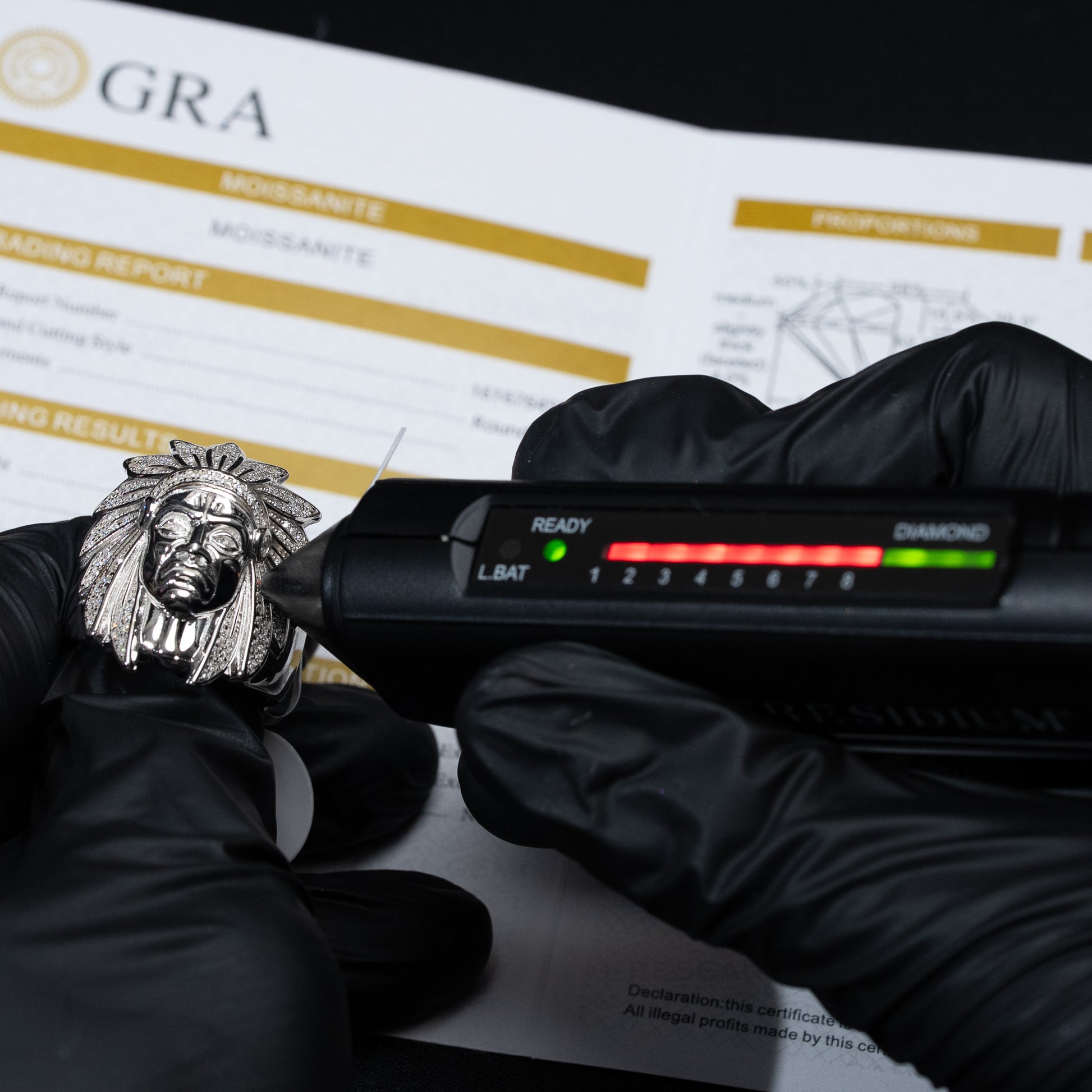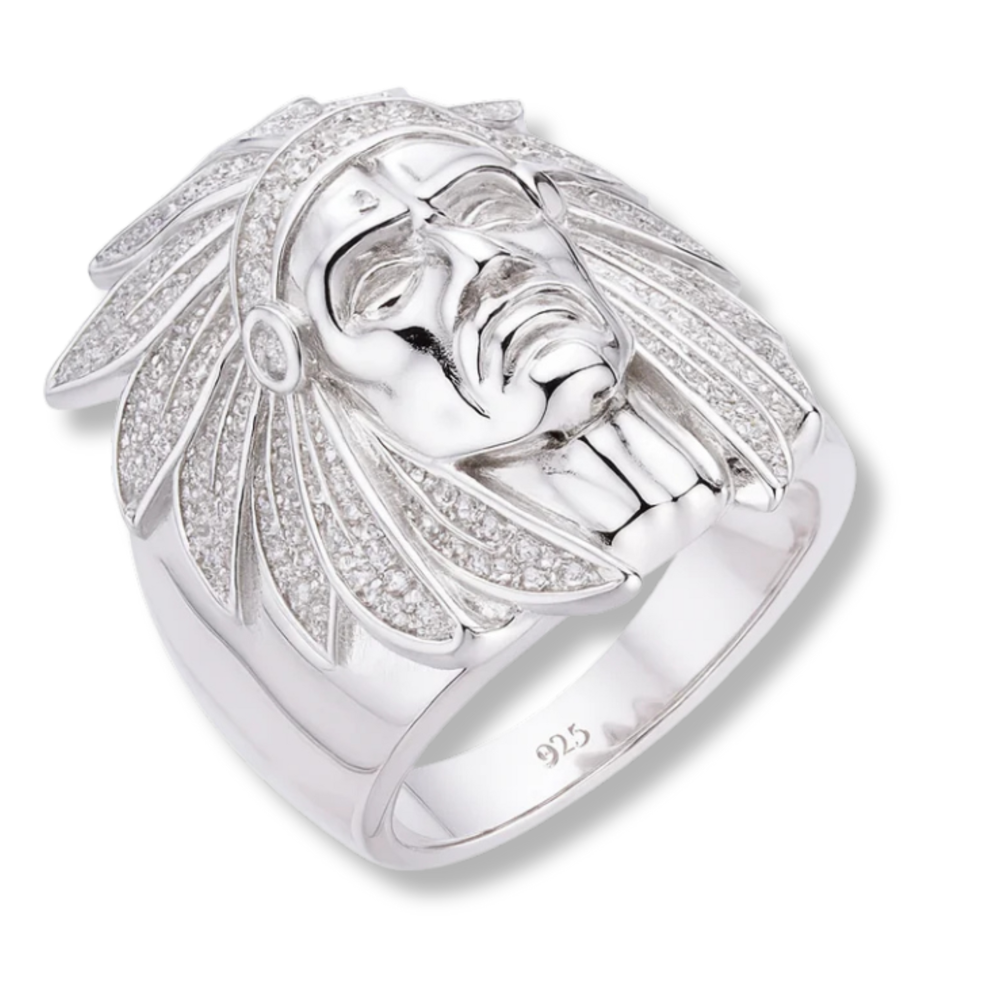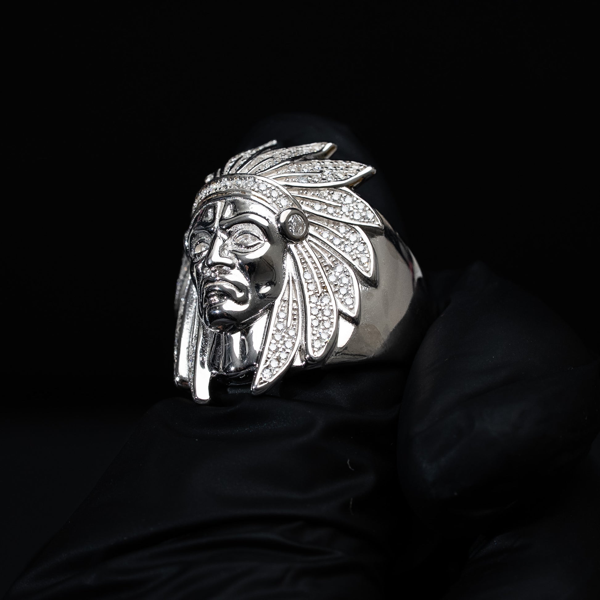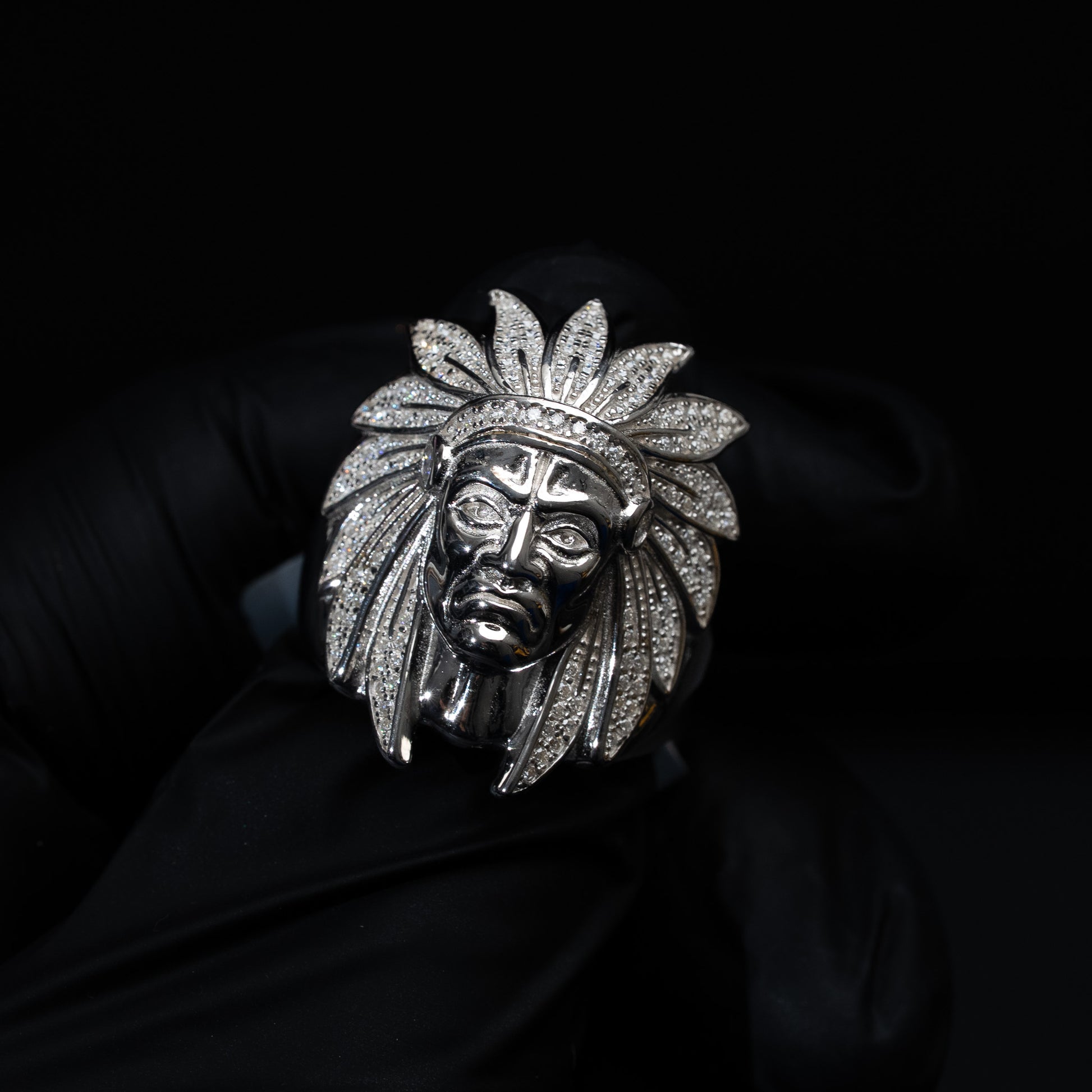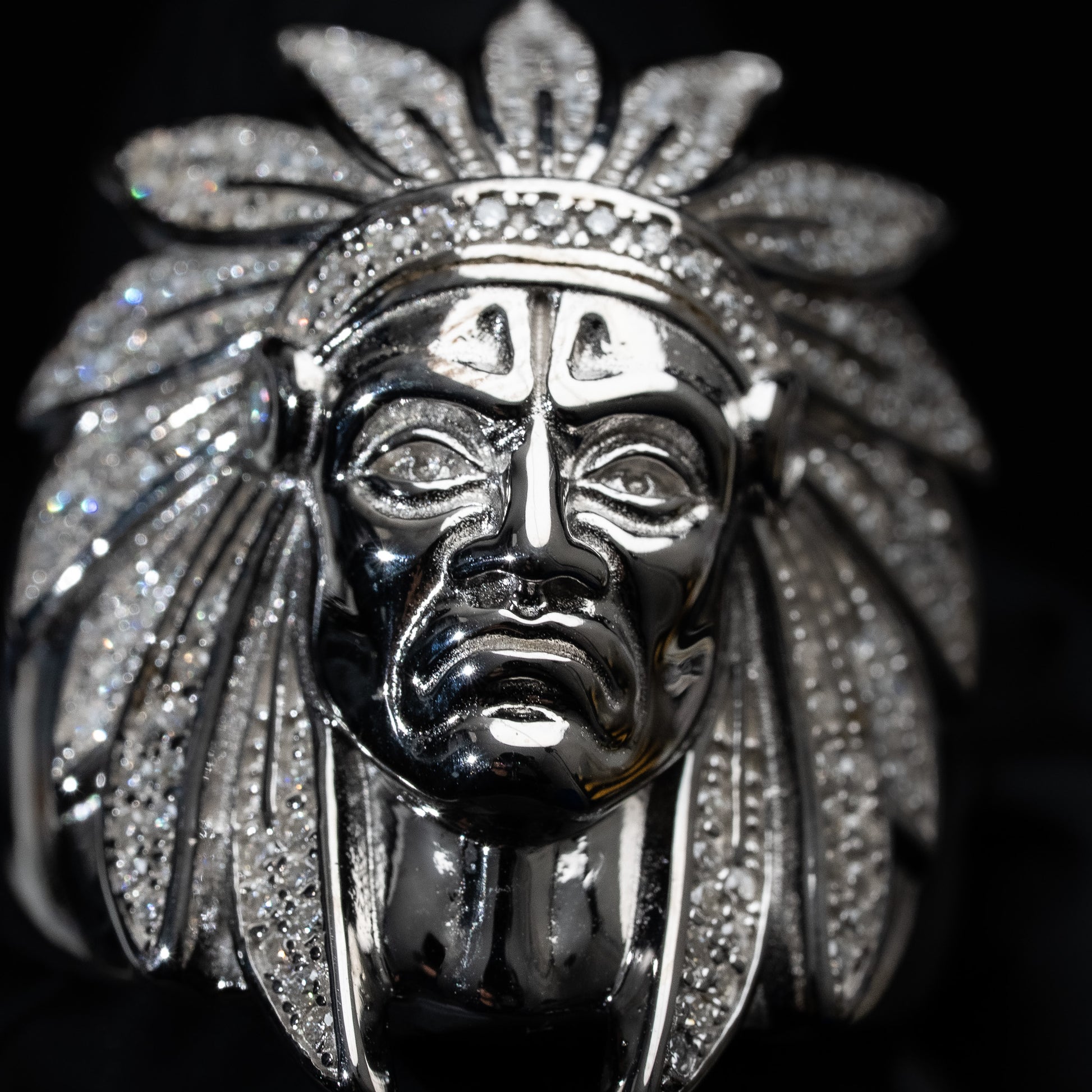 - Design: Native American warrior head with moissanite accents