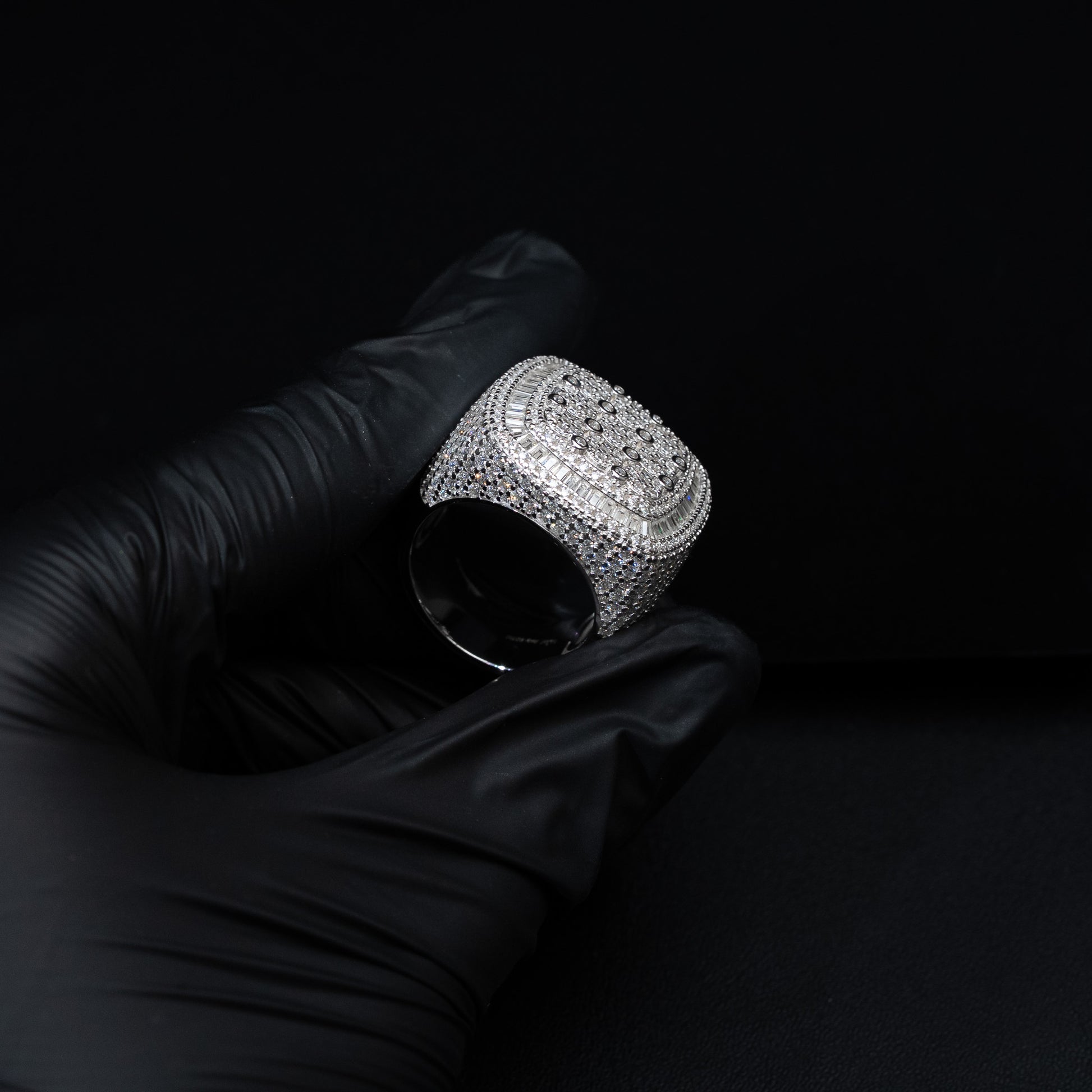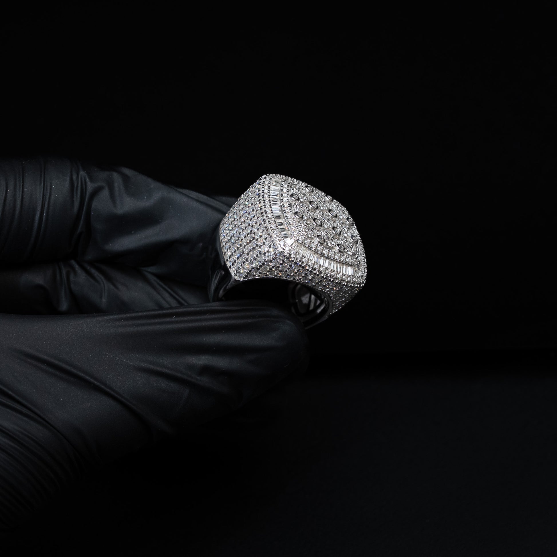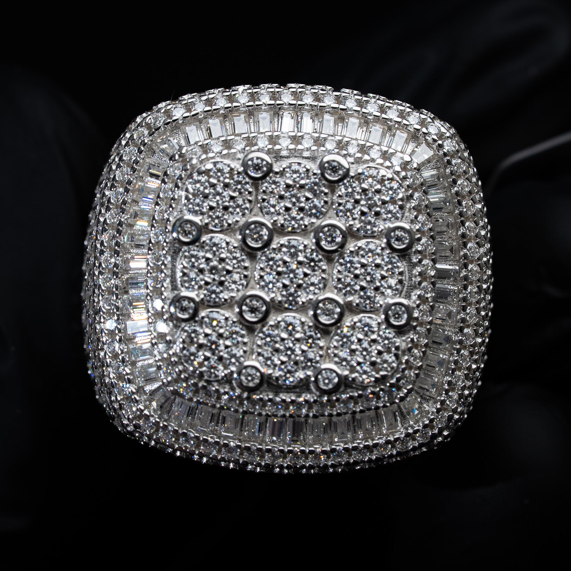 Make a bold impression with this moissanite ring, fully iced for maximum brilliance. Crafted in solid 925 sterling silver, this luxury ring features a combination of baguette and round-cut VVS1 D color moissanite stones in a square face layout that radiates power and precision.