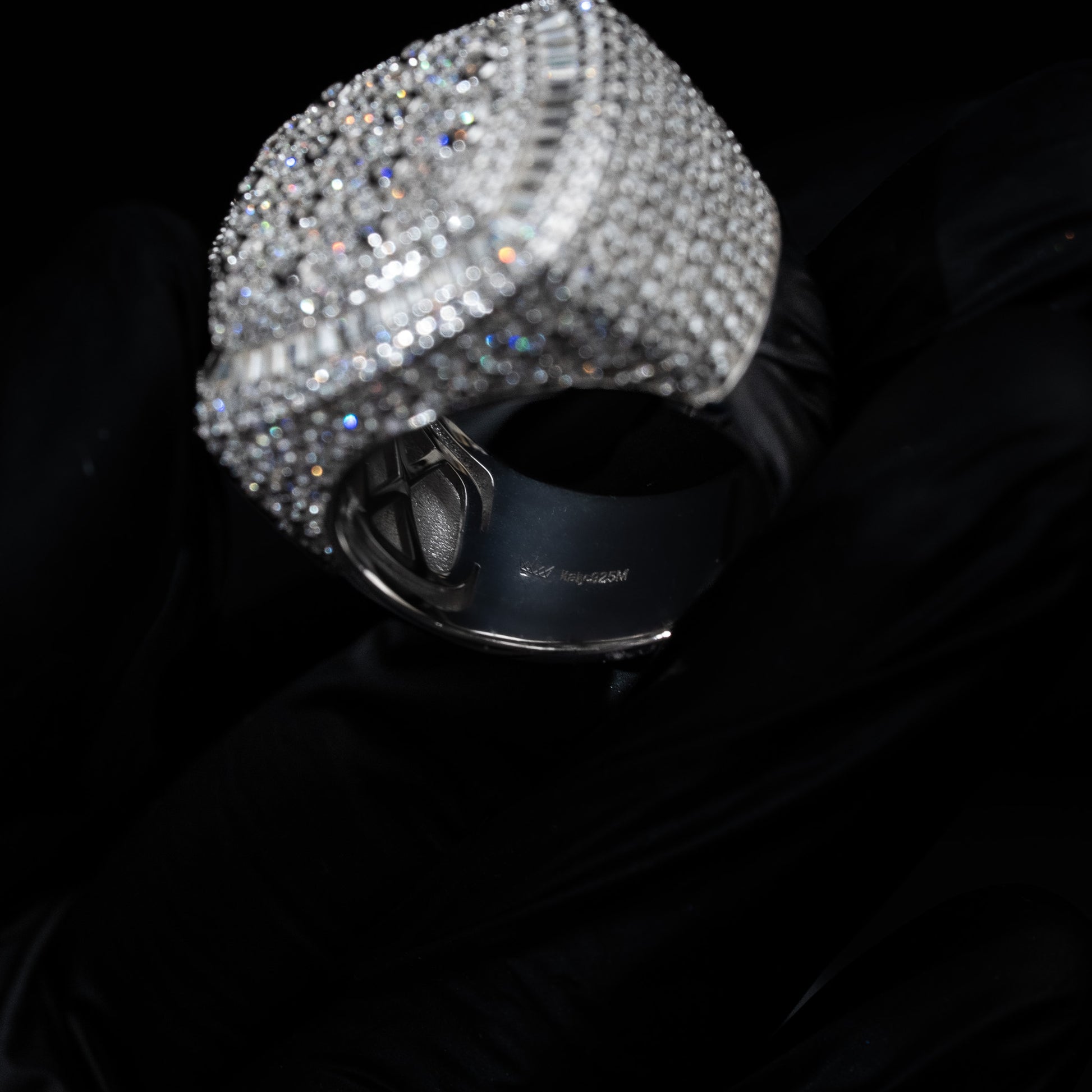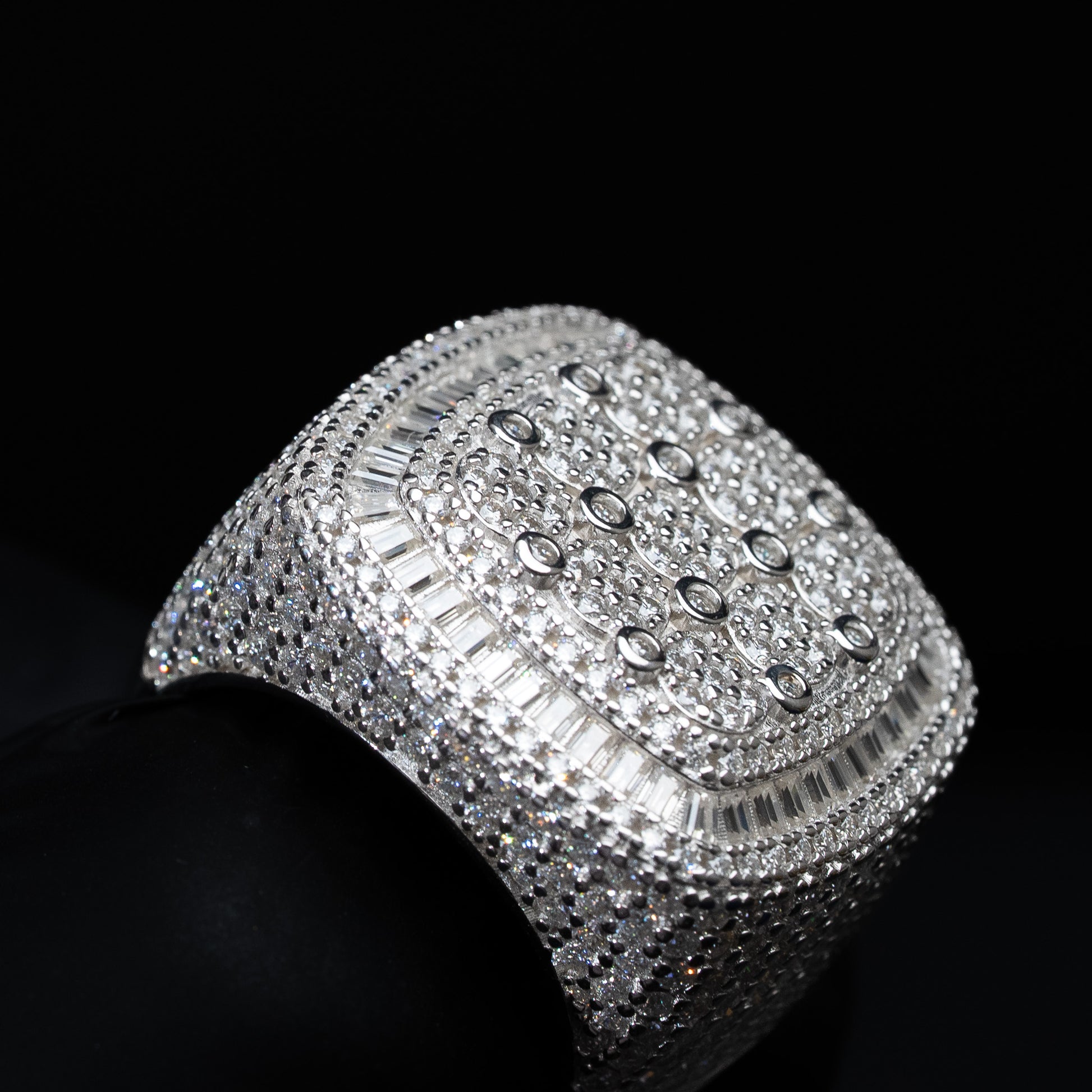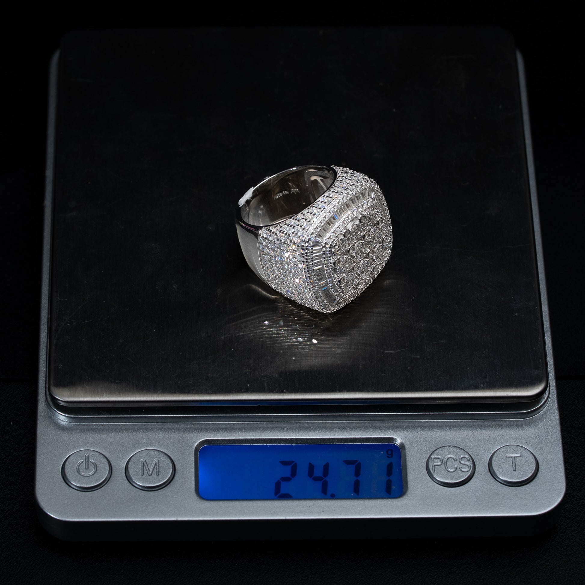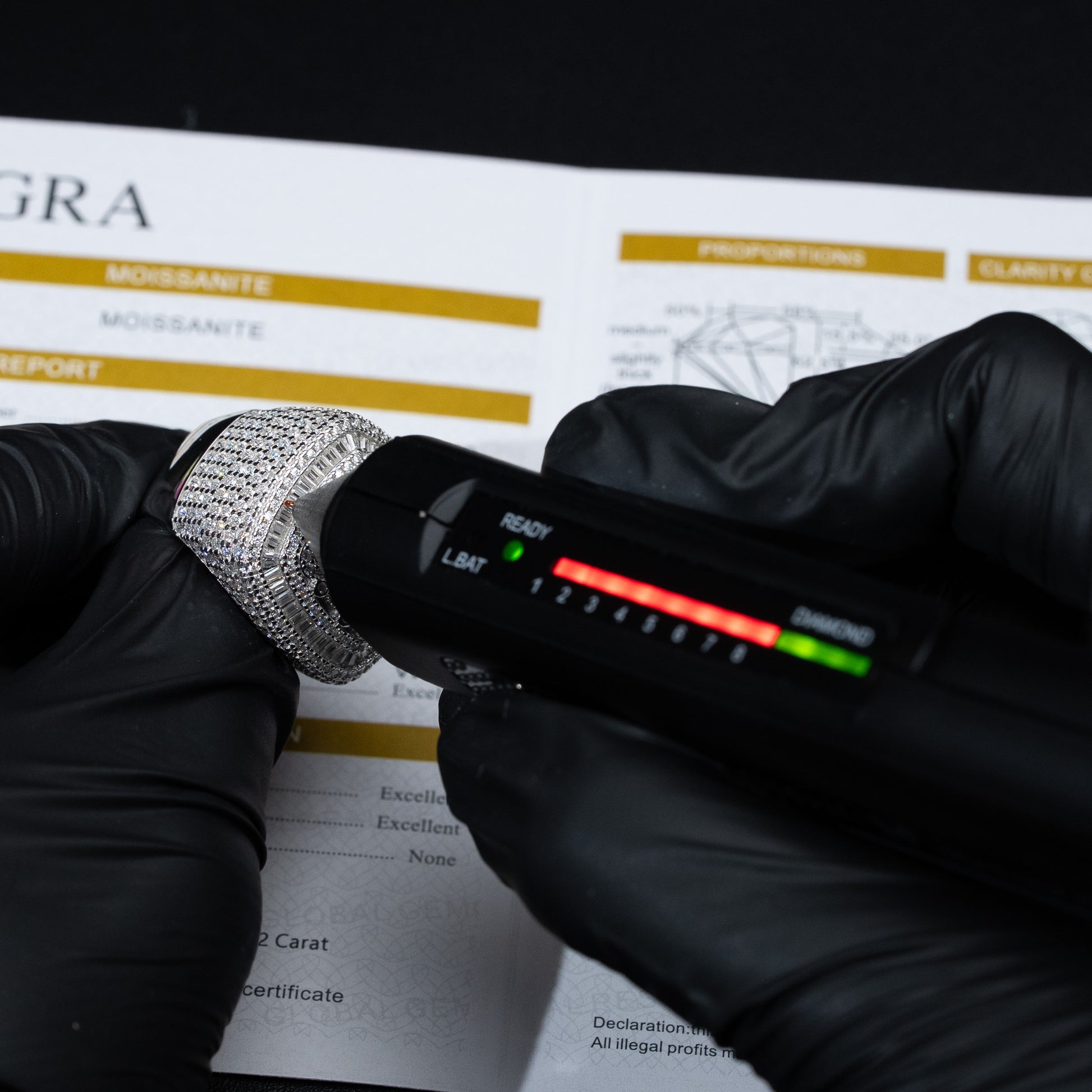 Make a bold impression with this moissanite ring, fully iced for maximum brilliance. Crafted in solid 925 sterling silver, this luxury ring features a combination of baguette and round-cut VVS1 D color moissanite stones in a square face layout that radiates power and precision.