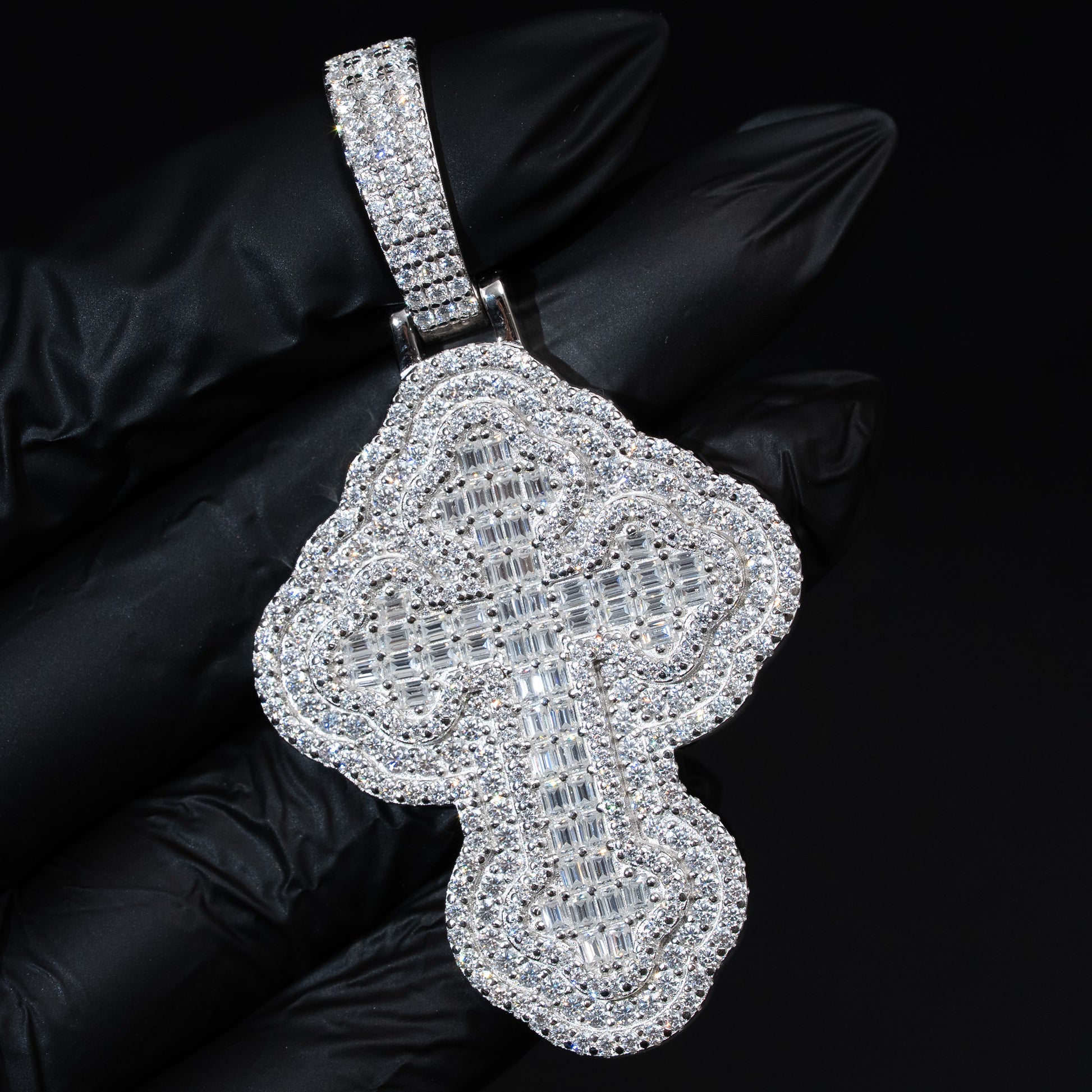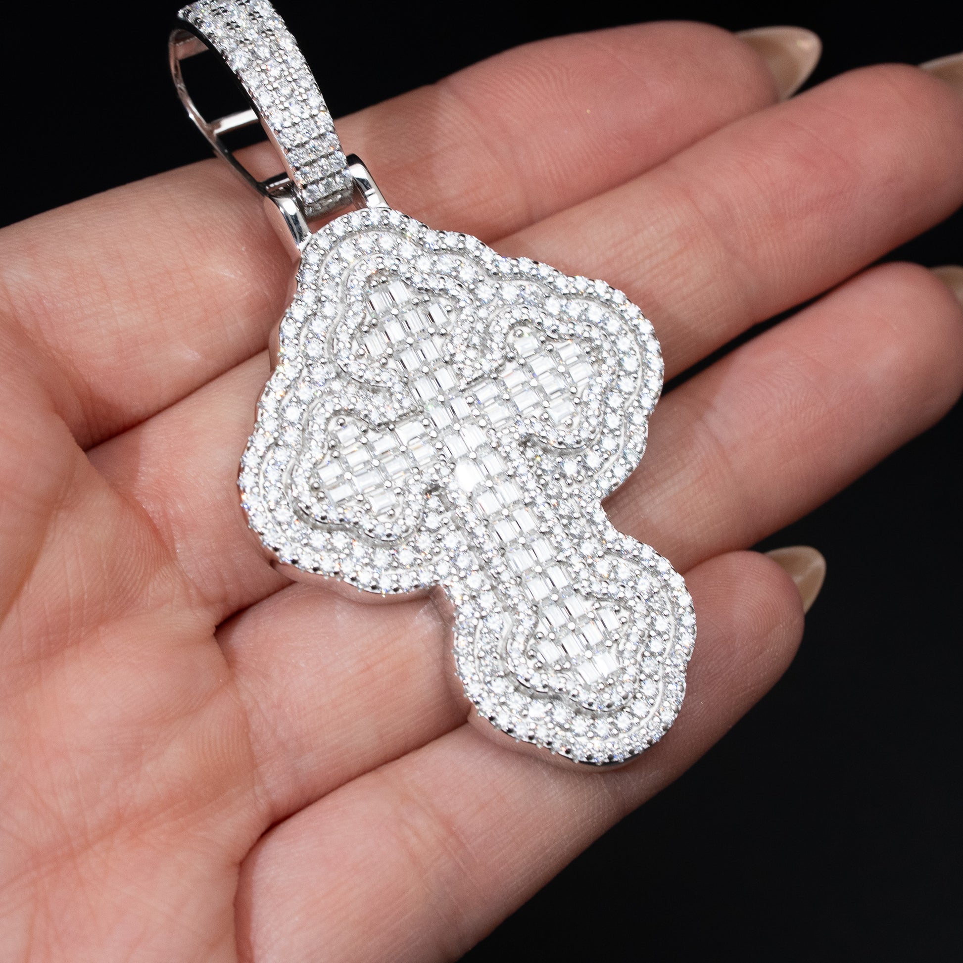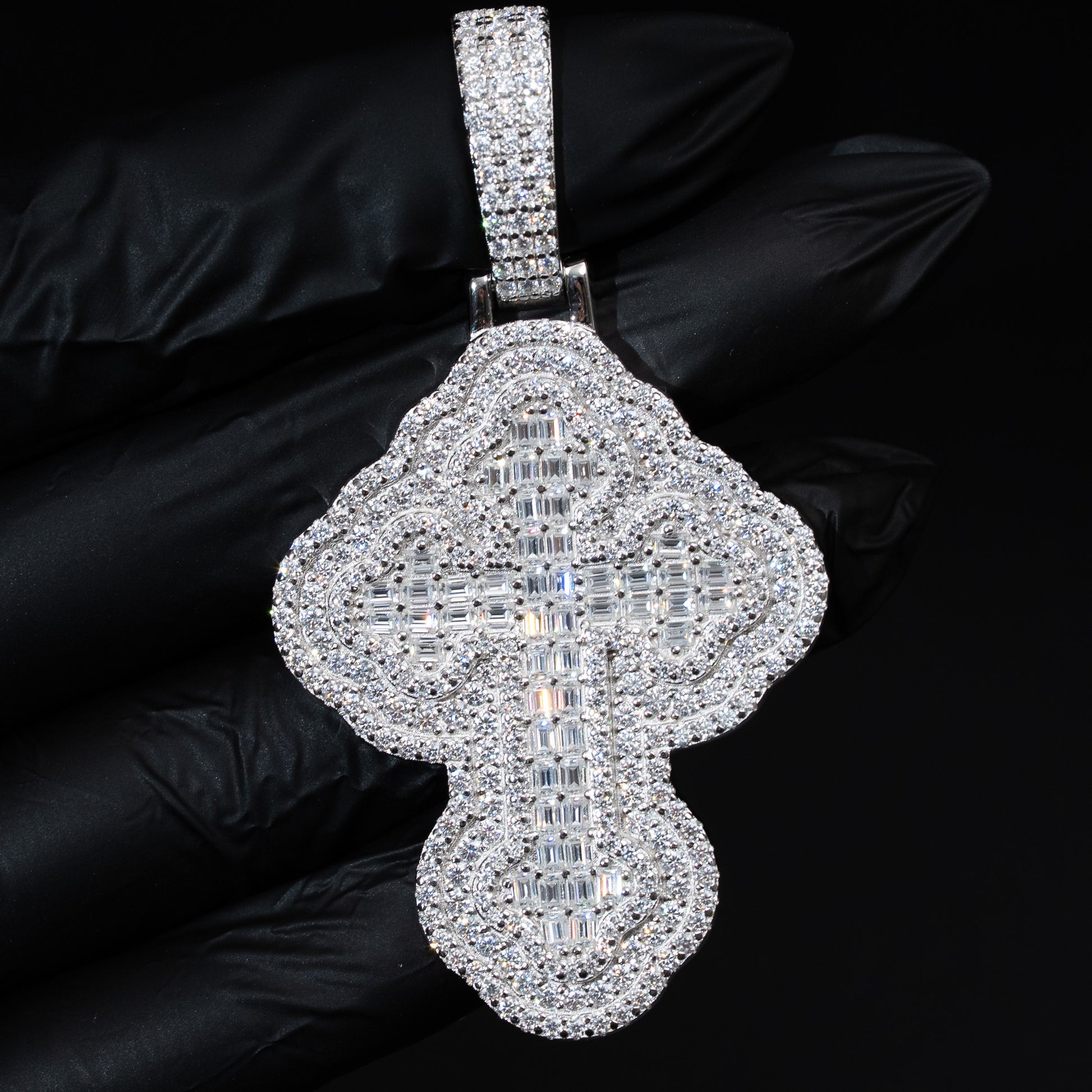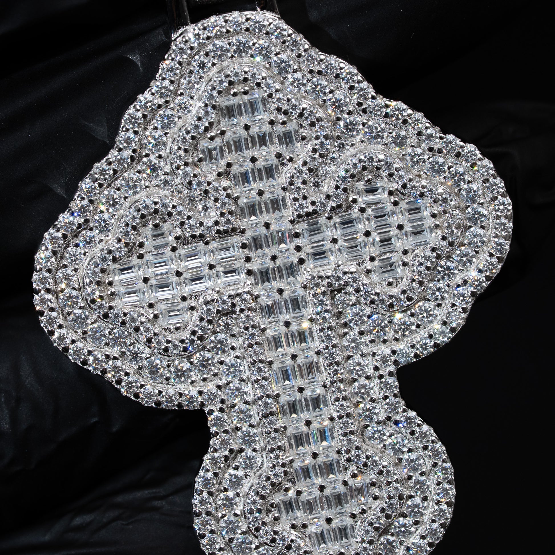 Moissanite Iced Round Baugette Cross Pendant 925 Sterling Silver - 3 sizes