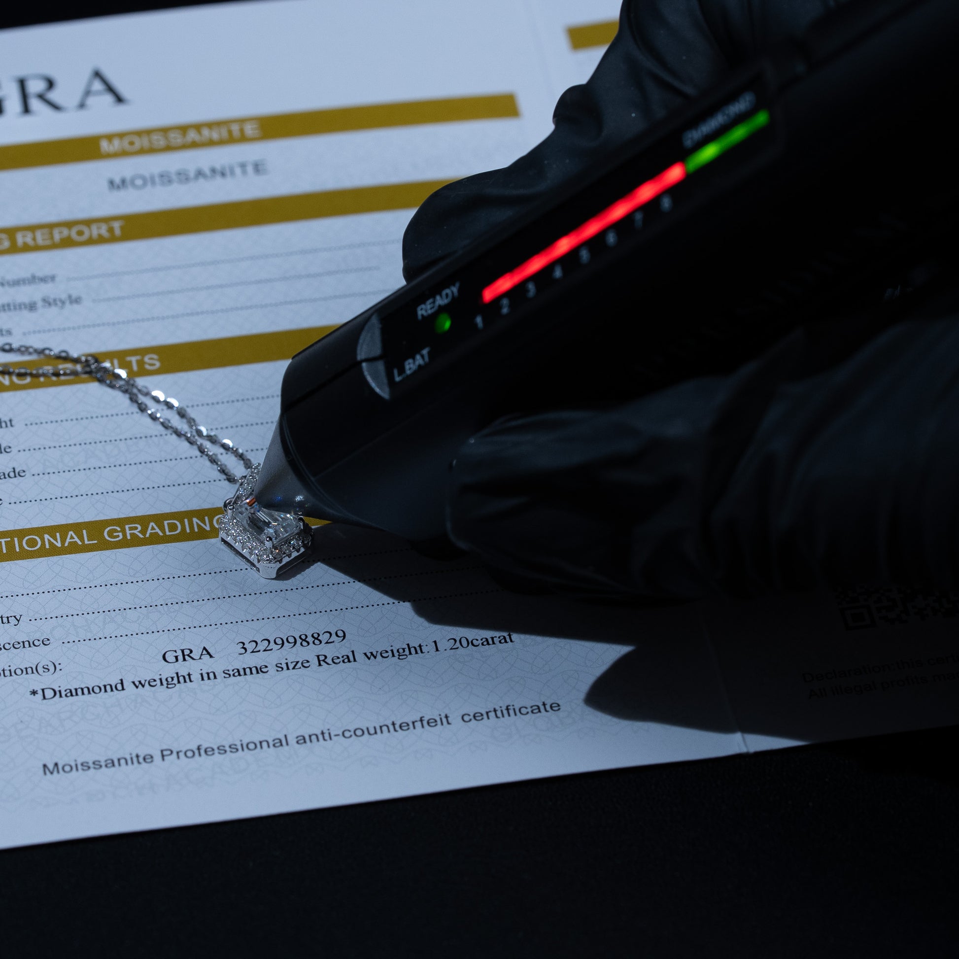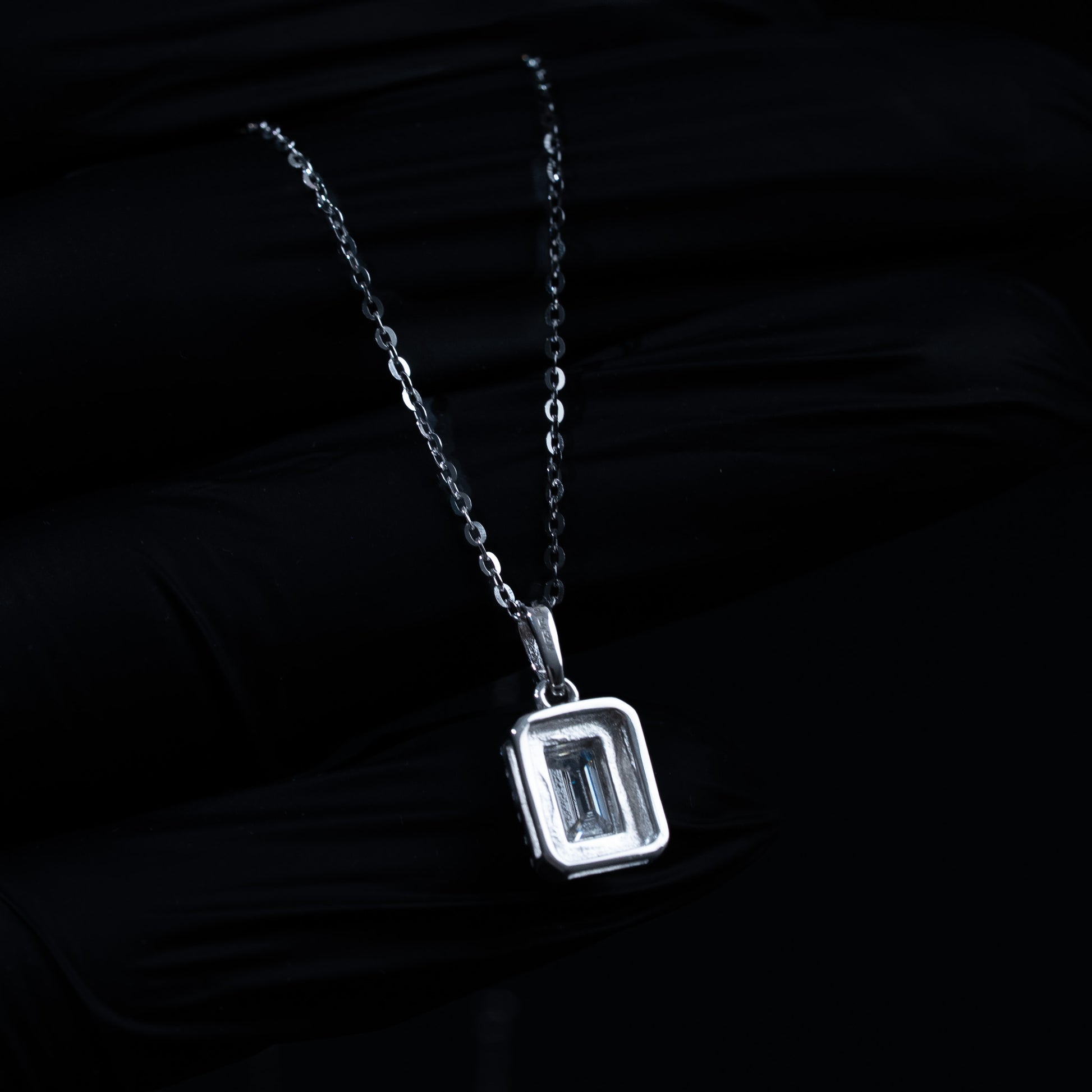 This Moissanite Emerald Cut Halo Necklace showcases timeless elegance with a striking emerald-cut center stone surrounded by a brilliant halo of VVS D color moissanite. Set in 925 sterling silver and finished with a fine chain, it’s a perfect piece for women who love refined sparkle.